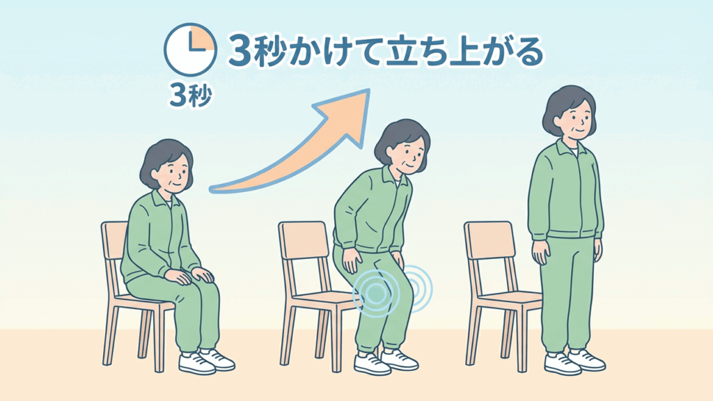 - お尻が座面に触れるか触れないかのところで止め、太ももの力で立ち上がります。