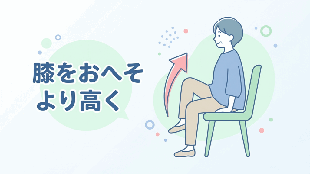まずは、階段でつまずかないように足を高く上げる筋肉(腸腰筋)を鍛えます。椅子に座って行うので転倒のリスクがなく安全です。