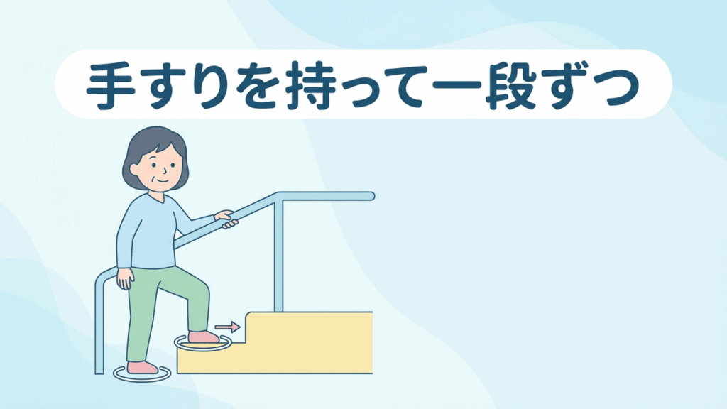 筋力がついてきたら、実際の階段の1段目(または安定した踏み台)を使って、昇り降りの感覚を掴む練習をしましょう。必ず手すりや壁を持って行ってください。