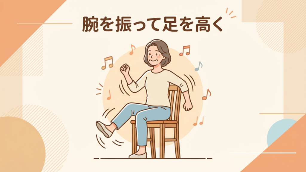 2. 腕を大きく振りながら、リズミカルに足踏みをします。