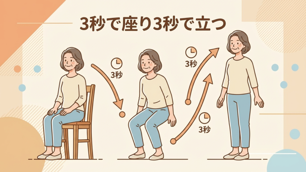 足腰の衰えを防ぐには、やはりスクワットが一番です。 室内にある椅子を使えば、膝への負担を減らしながら、安全に太ももとお尻を鍛えることができます。