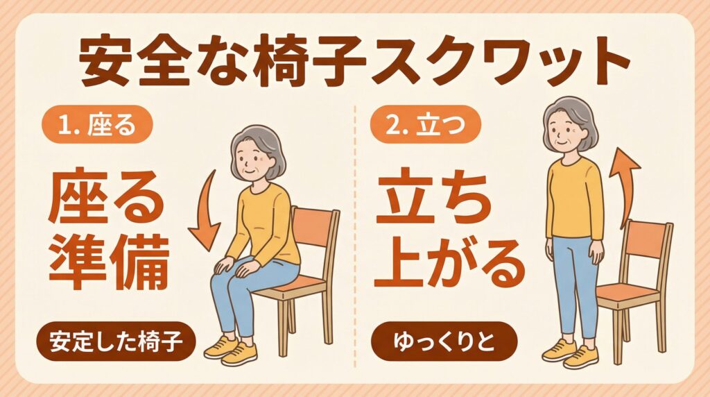 太ももやお尻といった大きな筋肉を効率よく鍛える運動です。転倒防止のため、椅子の背もたれを持ったり、椅子の前で行ったりするなど安全を確保して行いましょう