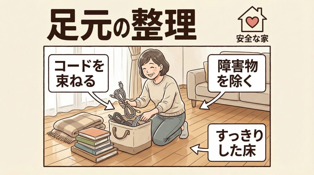 電気製品のコードは壁に這わせるか、モールで固定します。カーペットやラグの縁がめくれ上がっていると非常に危険です。裏面に滑り止めテープを貼るか、段差の少ない薄手のものに変える、あるいは思い切ってカーペットを撤去するのも一つの方法です。