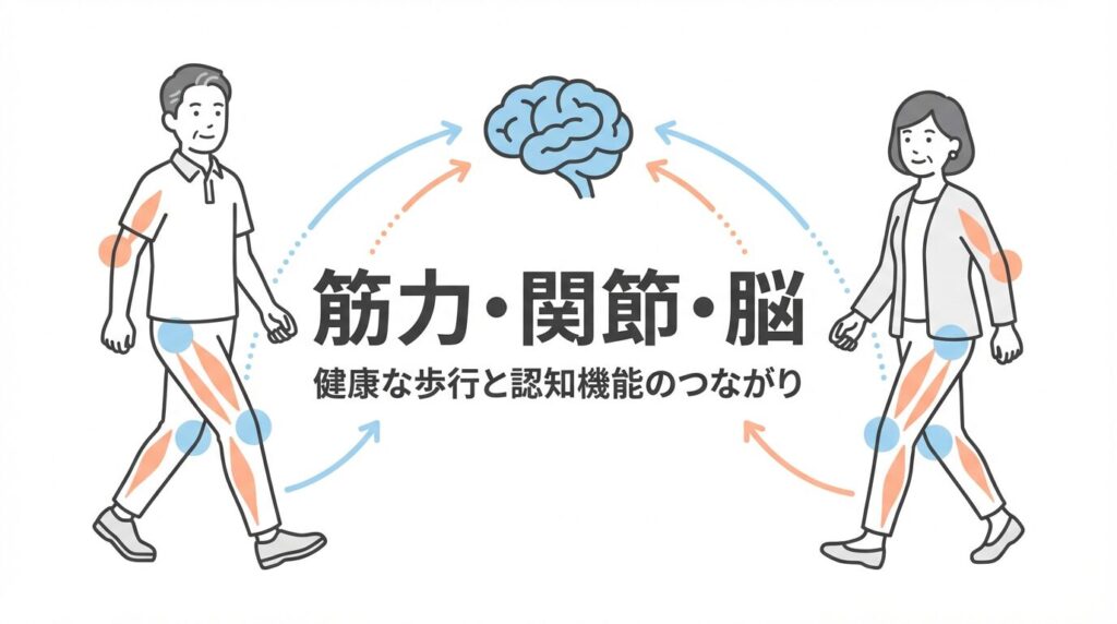 意外と知られていないのが「脳」との関係です。歩くという行為は、周囲の状況を見て、目的地を認識し、手足をバランスよく動かすという、高度な脳の情報処理が必要です。脳の司令塔としての機能が低下すると、歩行のリズムが乱れたり、速度が遅くなったりすることがあります。