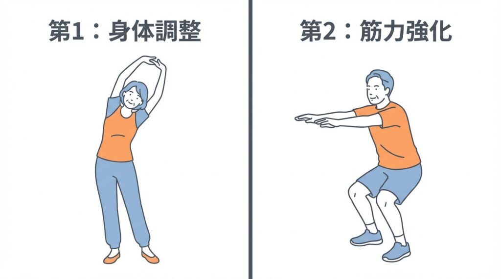 - ラジオ体操第2は、筋力を強化し体力をつける(職場・若者向けだが調整して高齢者も可)。