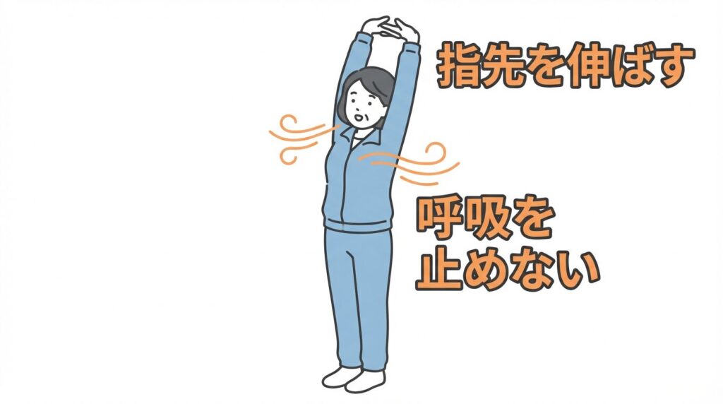 - 指先まで意識して伸ばす: 腕を振る動きや体を曲げる動きでは、指先や関節をしっかり伸ばすことを意識しましょう。可動域が広がり、ストレッチ効果が高まります。