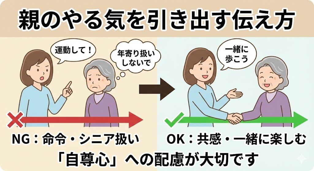 離れて暮らす親、あるいは同居する親のそんな姿を見て、焦りを感じている方は少なくありません。しかし、良かれと思って「運動しなさい」と言っても、反発されたり、聞き流されたりして、親子喧嘩になってしまうことも多いものです。