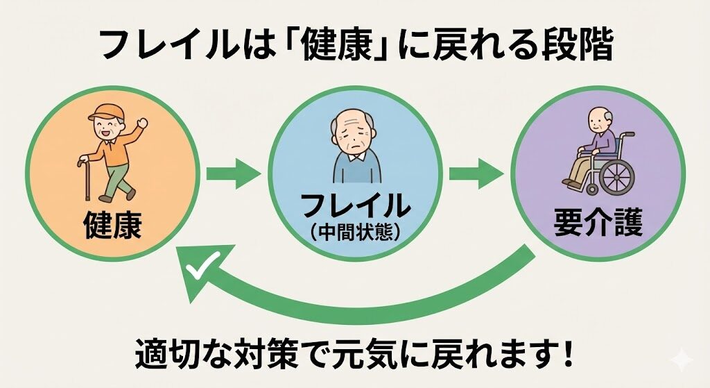 私たちは、「フレイル」を単なる加齢による衰えとは捉えません。フレイルとは、「健康と要介護の間の、適切な対策によって健康な状態に回復可能な段階」であると定義します。この「可逆性」こそが、行動を促す希望のメッセージとなります。