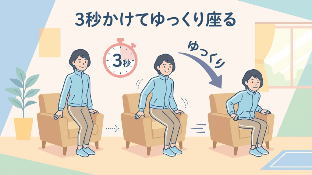 4. ここがポイントです。座る時こそトレーニングです。ドスンと座らず、3〜4秒かけてゆっくりとお尻を椅子に下ろします。太ももの筋肉がプルプルするのを感じてください。