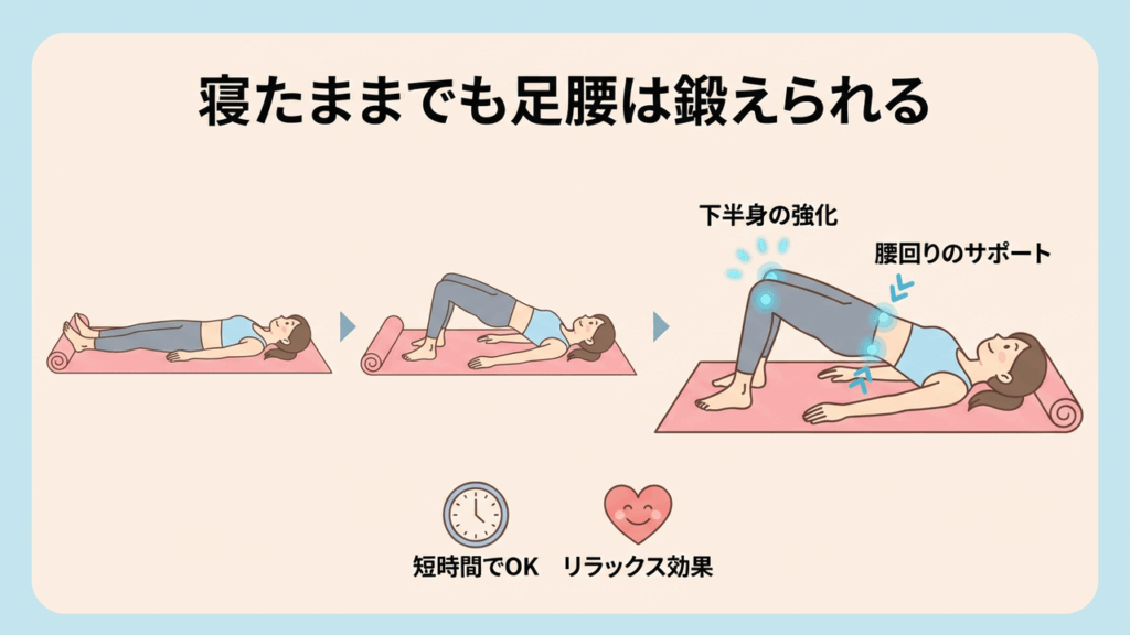 立って行う運動が不安な方や、腰痛持ちの方におすすめなのが、寝転がって行うお尻上げ運動です。 お尻の筋肉(大殿筋)と、太ももの裏側、そして背中の筋肉を同時に鍛えることができ、姿勢の改善や歩幅の拡大に役立ちます。