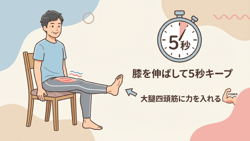 膝が痛くて体重をかけるのが怖いという方には、座ったままできる膝伸ばし運動が最適です。 これは太ももの前側の筋肉(大腿四頭筋)を集中的に鍛える運動です。この筋肉がつくと、膝のお皿が安定し、歩行時の膝の痛みが軽減する効果が期待できます。